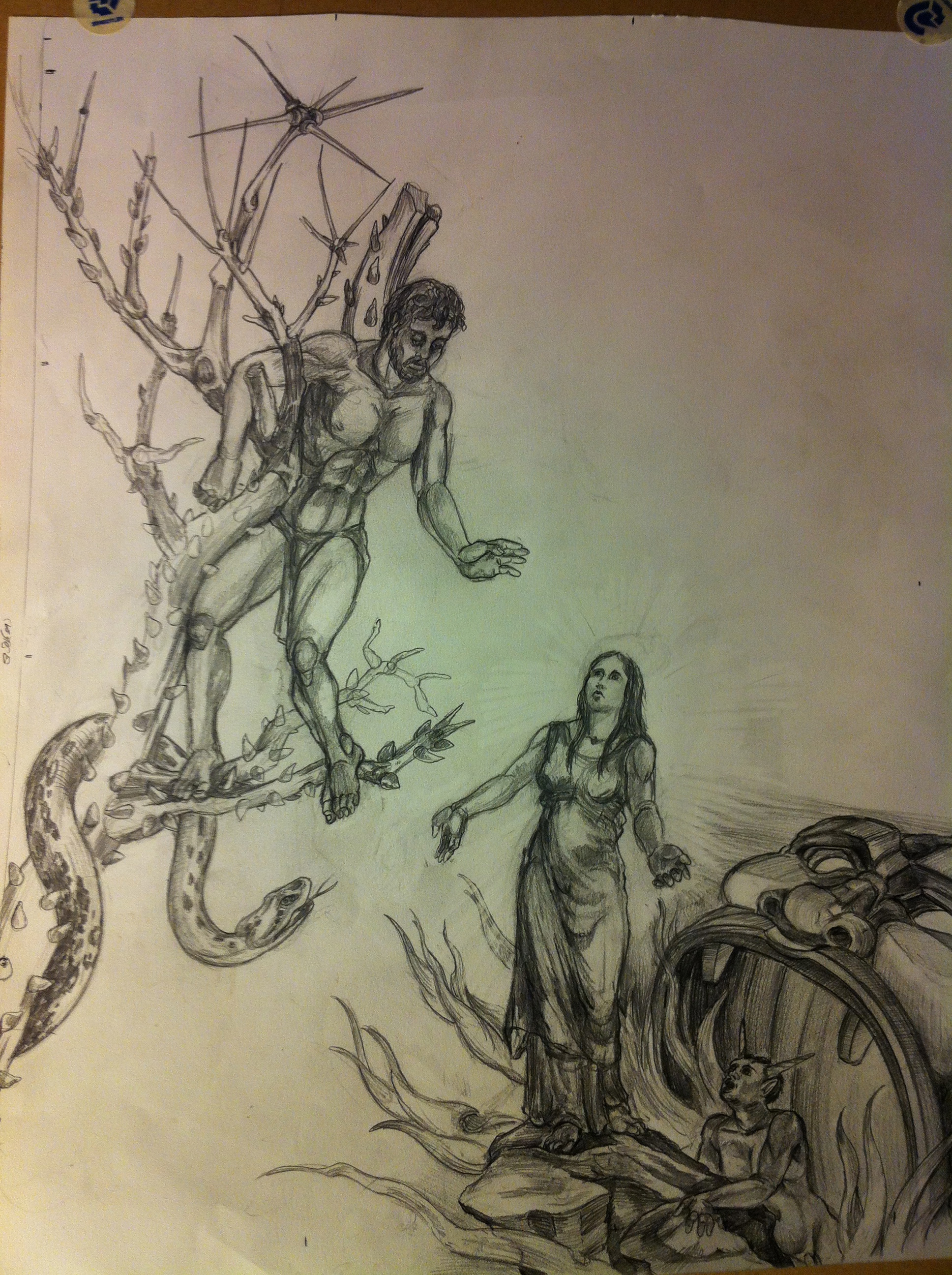 Now that I have cobbled together a few maquettes (eager to make a few more), I feel I have sufficient a crew to compose a composition . I am hoping to depict that fateful moment when the princess Xquic miraculously finds her self with child – twins actual, the Hero Twins. Making use of the World Tree maquette along with the Maize God and Xquic, I spent much of yesterday just arranging little paper dolls , it was a great deal of fun. Last evening and much of today was sketching out ideas. Two, thus far, are beginning to pass muster. The rest, well it is safe to say my garbage can runneth over.