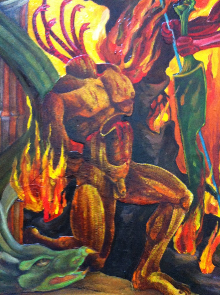 With that I close, having attempted to depict an epic tale of wrathful demon-gods, a virtuous savior, a virgin birth and heroic infants on a rather limited 20 by 30 inch canvas.