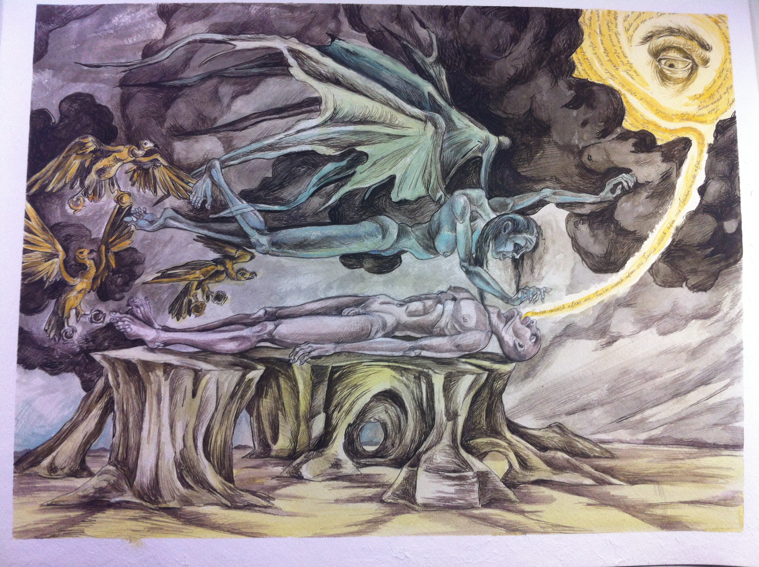 Upon awaking the next morning I was determined to record the wretched scene as a watercolor ( a medium that seems well suited to dreamscapes, just ask Blake).