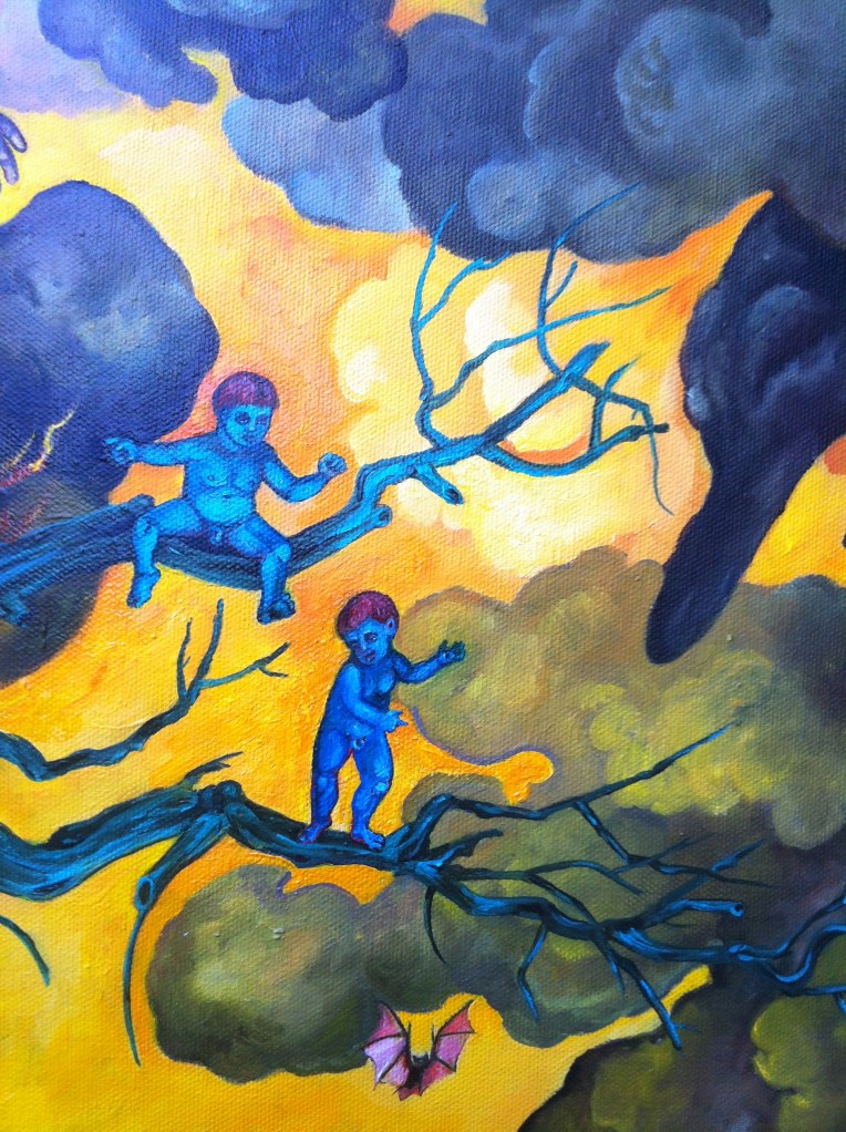 I finished this painting last week. Certain elements of the painting are experimental, most specifically the use of canvas cutouts applied to the canvas. Inspired by Clive Hicks-Jenkins’ use of maquettes, I created figures and attached them to the canvas.