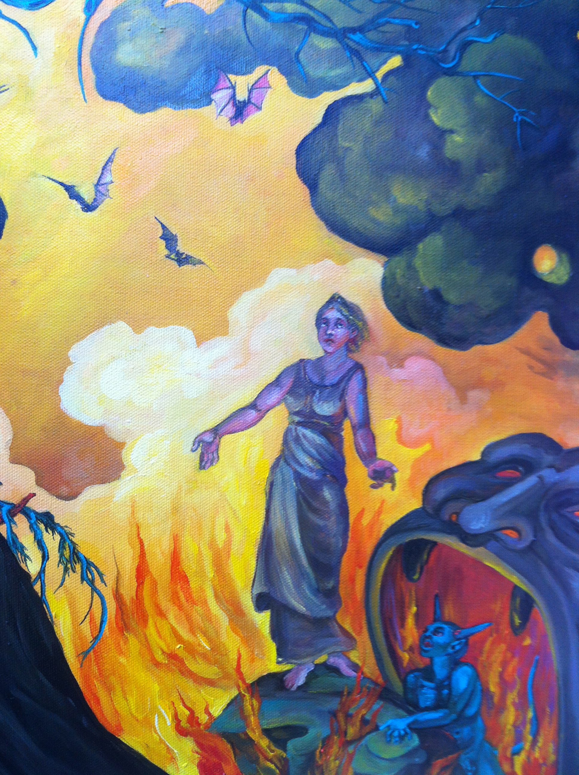 The following is a detail (as the image is rather small) of Xquic and her sons the Hero Twins, Hunahpu and Xbalanque. As I progress in this series I continue to paint the Twins blue. There isn’t a tradition for this, I just like the effect, an homage to Clive Hicks-Jenkins.