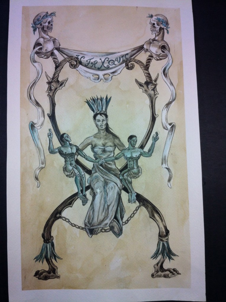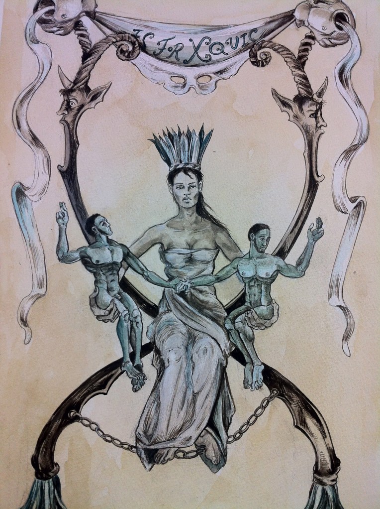 As I mentioned last time I will be jumping about the alphabet. As I began with “A”, “X” seemed the logical choice. I chose Xquic, the princess of Xibalba. For those who have followed this narrative , and not been daunted by the tongue twisting names, you will remember she is the heroine of the Popol Vuh narrative. Having miraculously given birth to the Hero Twins, I present her enthroned upon an “X” chair.
