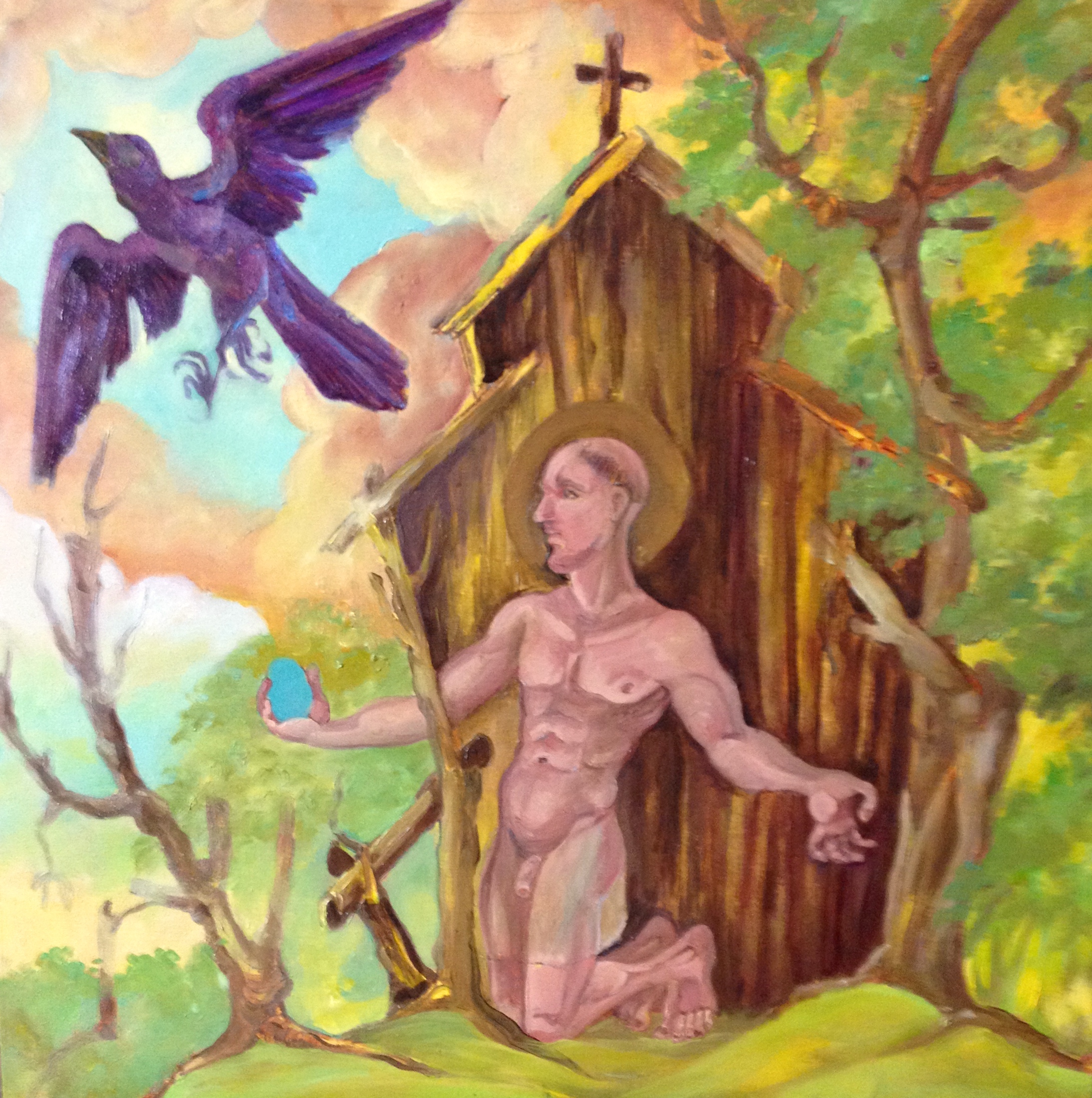 This is a small panel, only 12 by 12 inches, it is to be of St.Kevin and his blackboard. I’m basing it upon a relief print that I made last year . I’m enjoying my ability to stretch my wings so to speak with color; a sharp contrast to the print.