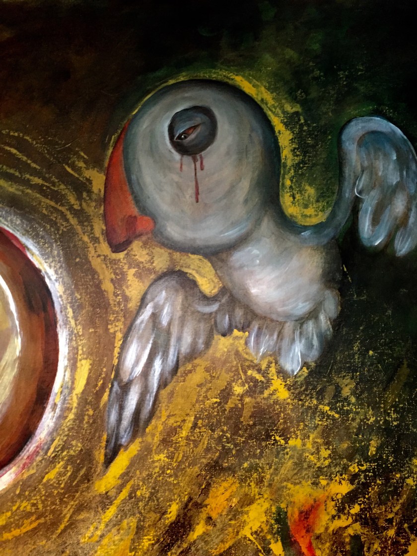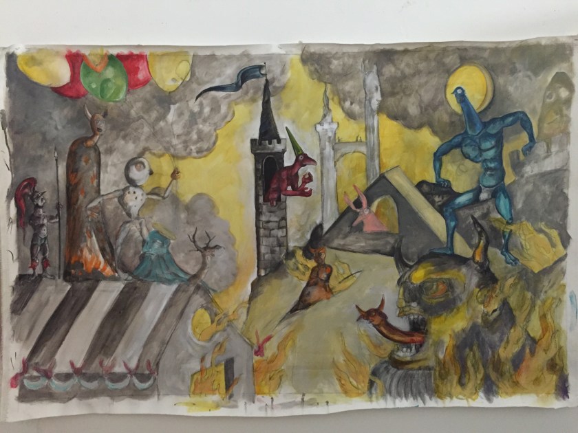 I approached the canvas with a light hearted spirit with my friend the Welsh artist Clive Hicks-Jenkins in mind . Clive no matter the subject always seems to approach his work with a smile . I wanted to channel that sense for no other reason than my own deflated personal ones.