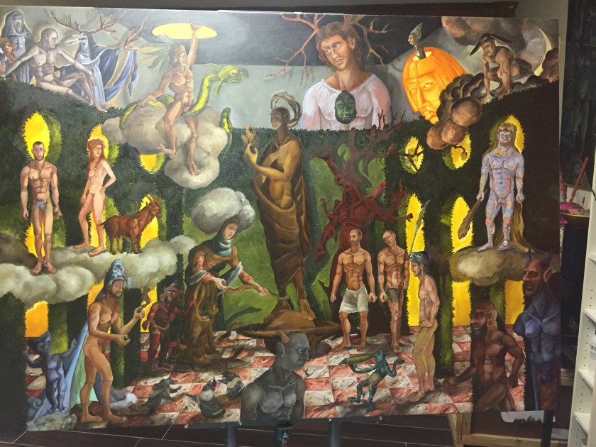 Just a detail of the painting I’m working on , clearly the spirit of Halloween is directing my brush. It’s been a great deal of fun, PLUS the dogs have been with me all day. Time to pack up and feed these delightful buggers.