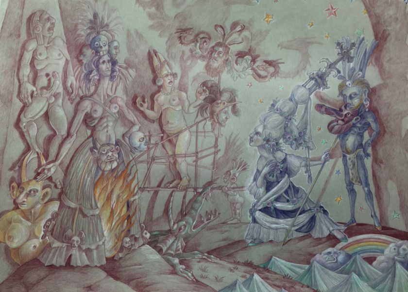 The Rape of Tenochtitlan, 2016, colored pencil on paper, 18 by 24″