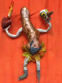 Previous Image Next Image The Magdalene “The Magdalene” 2017 Mixed media: acrylic paint, recycled rag, artificial foilage, thread, fiberfill Approx. 26 by 17 by 6″