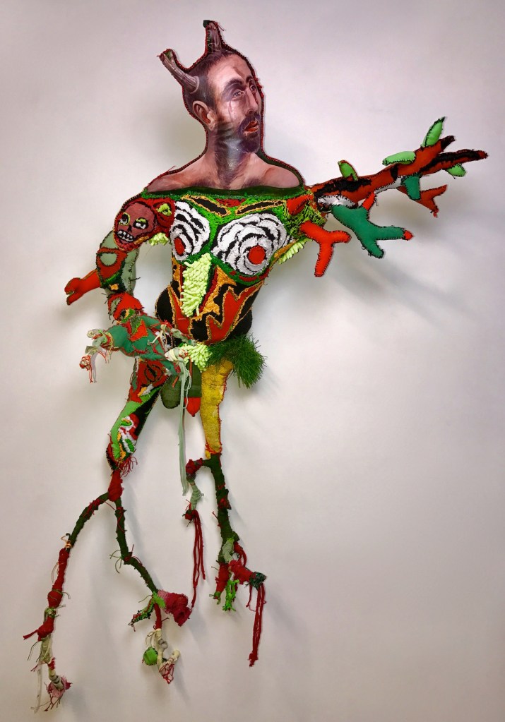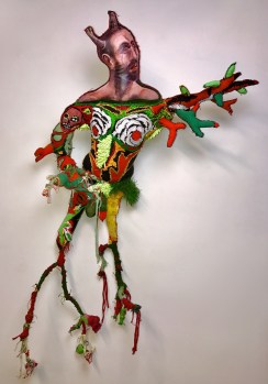 Previous Image Next Image Greco-Daphne “Daphne” 2017 Mixed media: acrylic painted recycled rag, embroidery floss,twigs, astroturf, poly-fill. 56 by 33 by 9 inches.
