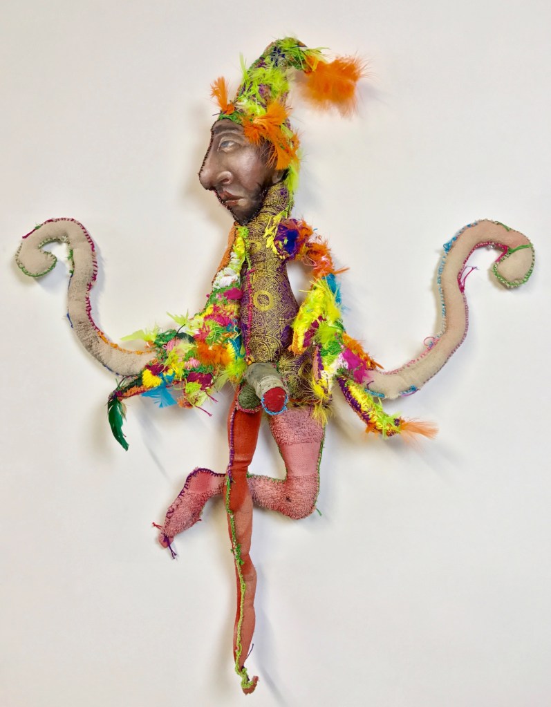 Previous Image Next Image Greco_Icarus “Icarus” 2017 Mixed media: acrylic painted recycled rag, embroidery floss, feathers, fiber-fill. 32 by 28 by 6 inches.