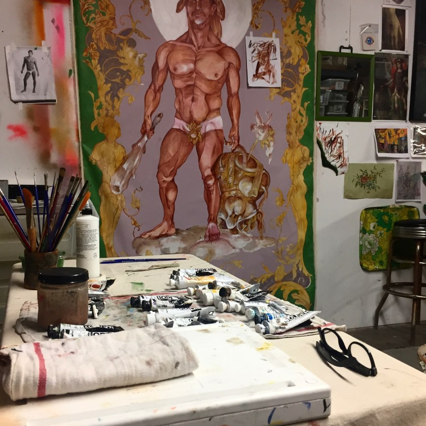 In my enthusiasm I’ve started a new piece, The Apotheosis of Herakles. It will be one of my faux tapestries, which in of itself allows me to play with fiber, sewing, domestic “feminine” craft, which along with ornament , has been traditionally eschewed- yet I’m drawn to both. The following is the beginning of the work.