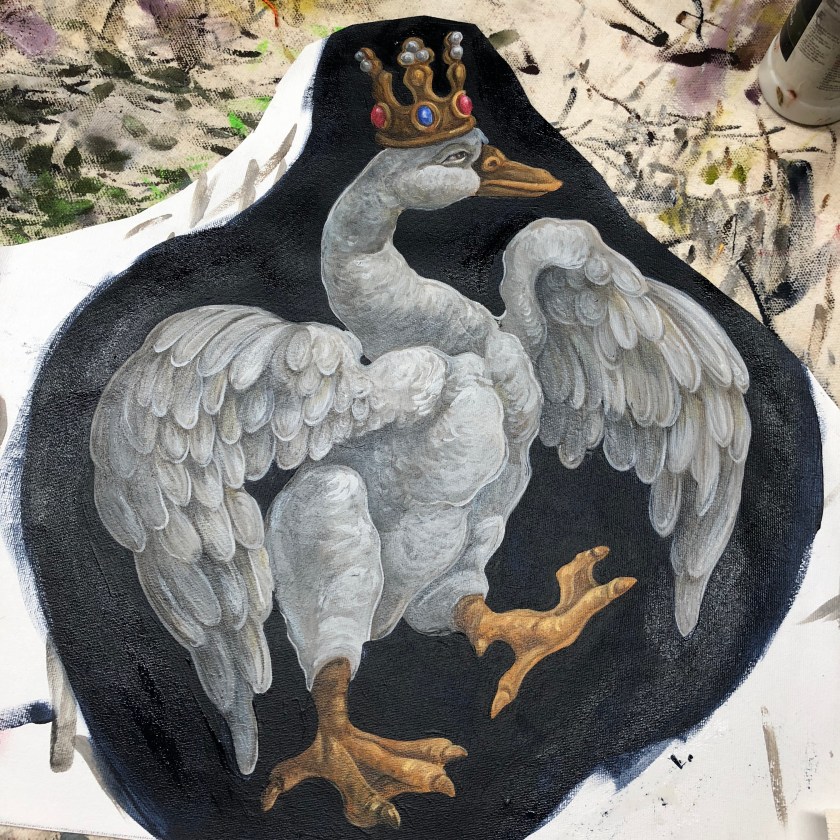 I have much to think about concerning this work of Wagner, many recordings to listen to (currently the ’62 Hans Knappertsbusch Bayreuth recording and the ’81 Bayreuth production directed by Wolfgang Wagner). But for the most part the making of this latest “stuffed painting ” has been intuitive. What delights me is how in sync my instinctive intentions were to Wagner’s- truly, archetypes are universal, known to all who listen and feel.