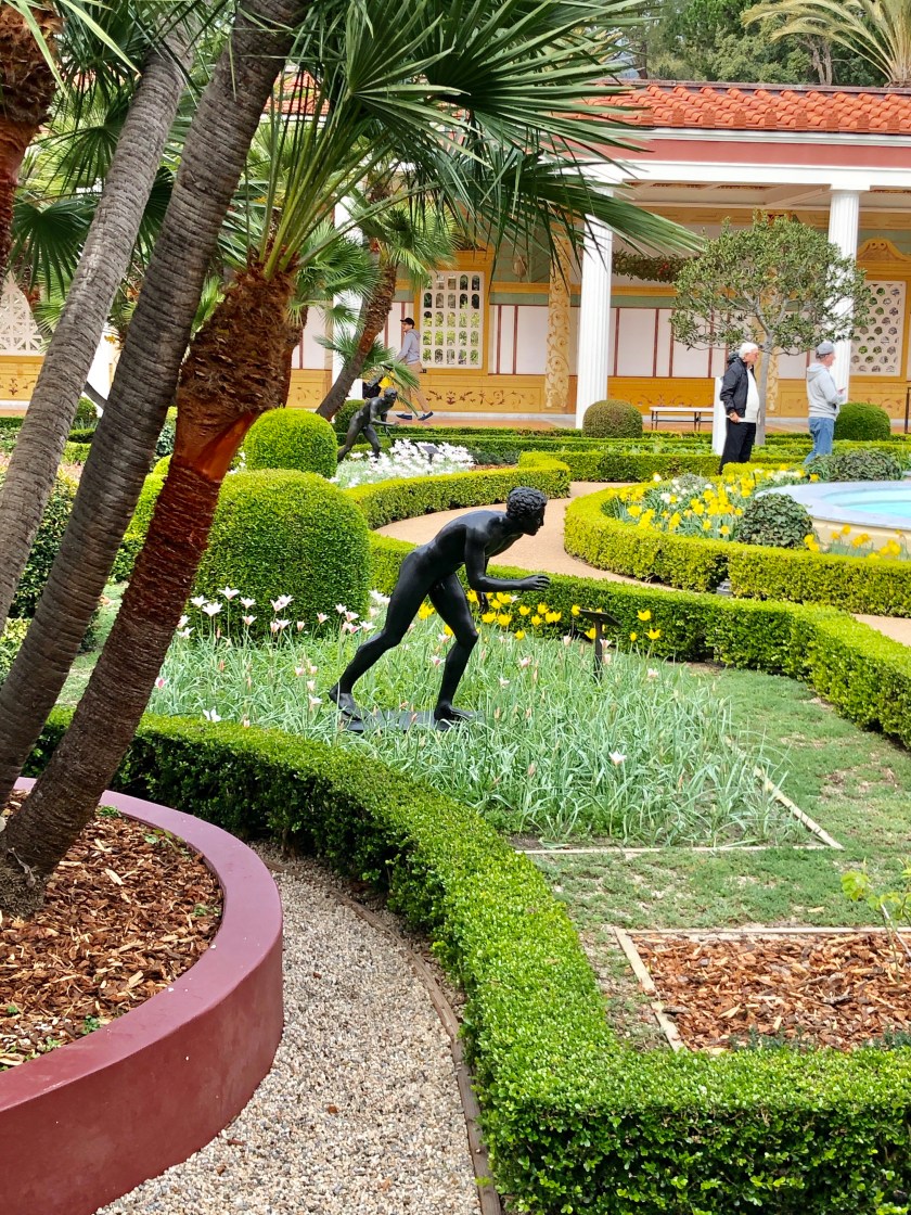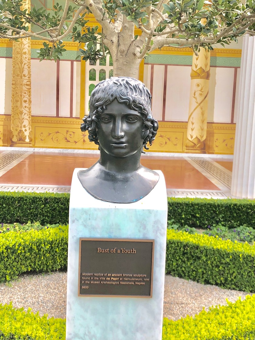 I visited the Getty Villa this morning with my sister Pamela who is visiting from back east . We arrived early enough that there weren’t many slack- jawed tourists incessantly snapping selfies . Instead we had the old gods and newly born spring blossoms to ourselves.