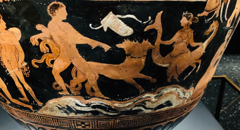 But I was particularly drawn to mighty Herakles , seen time and again battling the fearsome Cerberus- one of his tasks meant to redeem his terrible crimes, the murder of his wife Megaro and their sons the Herakleidai. From one funerary vessel to another his muscular frame could be seen wrestling that multi headed canine fiend .