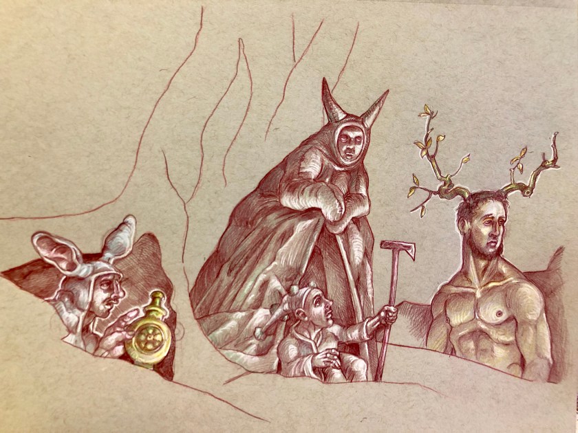 Orpheus’ Descent 2018 Sanguine and colored pencil on toned paper 18 by 24 inches