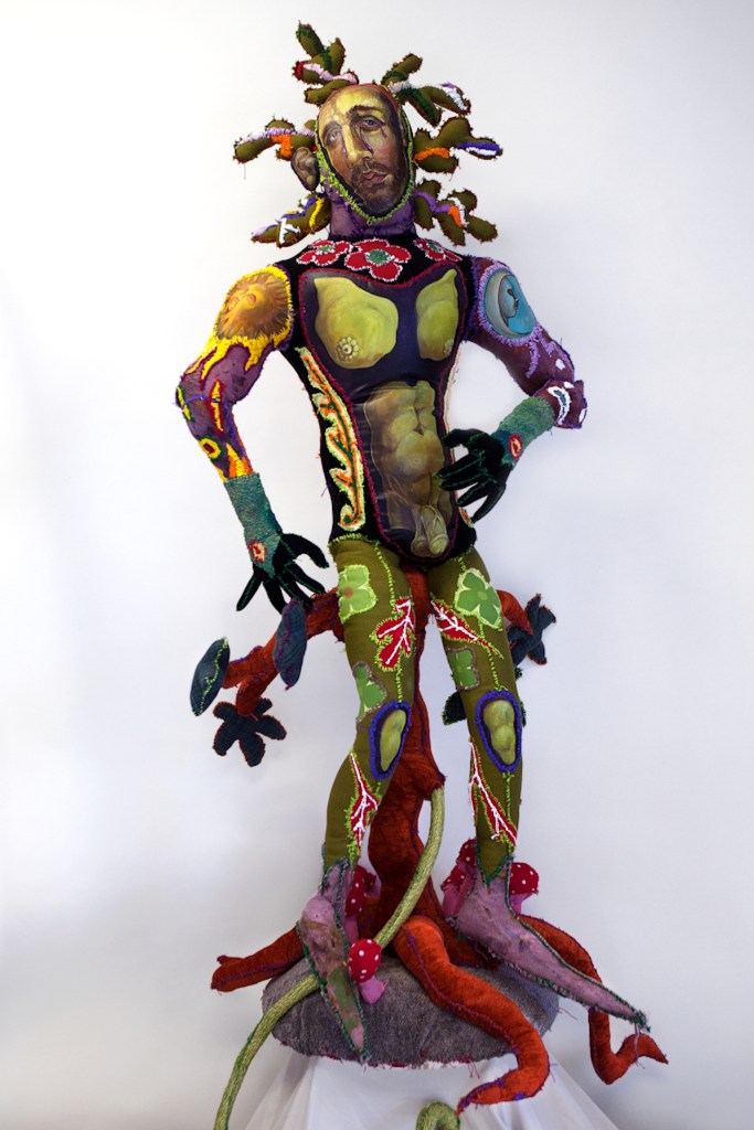 Mixed media: acrylic painted canvas, recycled fabric, embroidery floss, pipe/plywood interior structure, Poly-fil