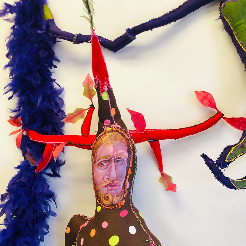 Further experiments in “stuffed paintings” resulted in this elfin trio of Fairyfellers: Rufus, Derrick and Seamus.