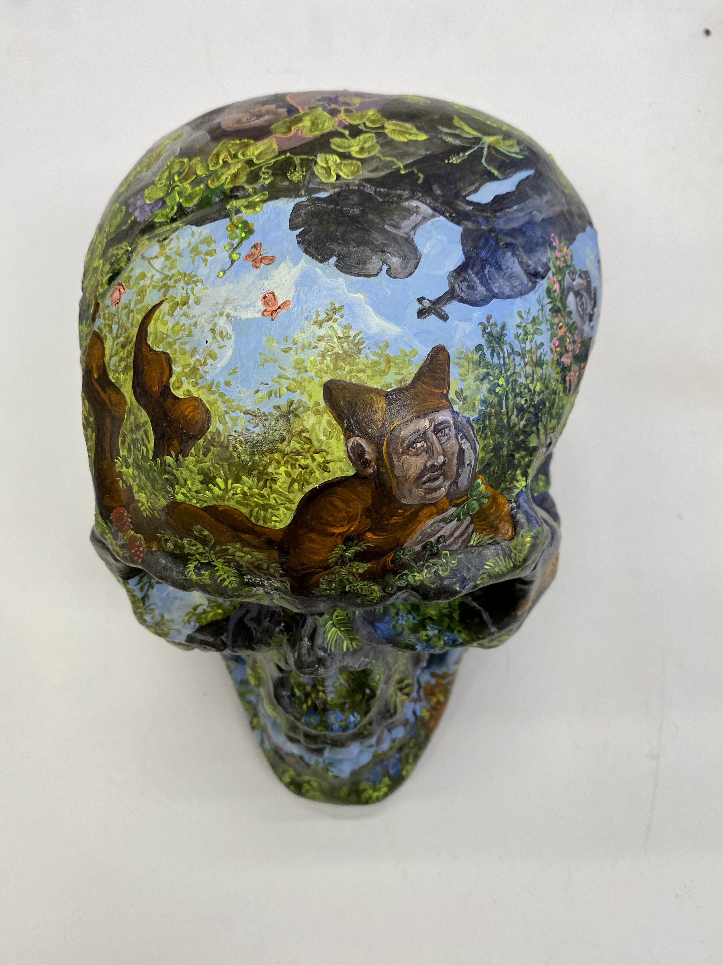 Previous Image Next Image IMG_6779 The Eternal Cycle (Holy Fool detail) 2021 Acrylic on life sized plastic skull