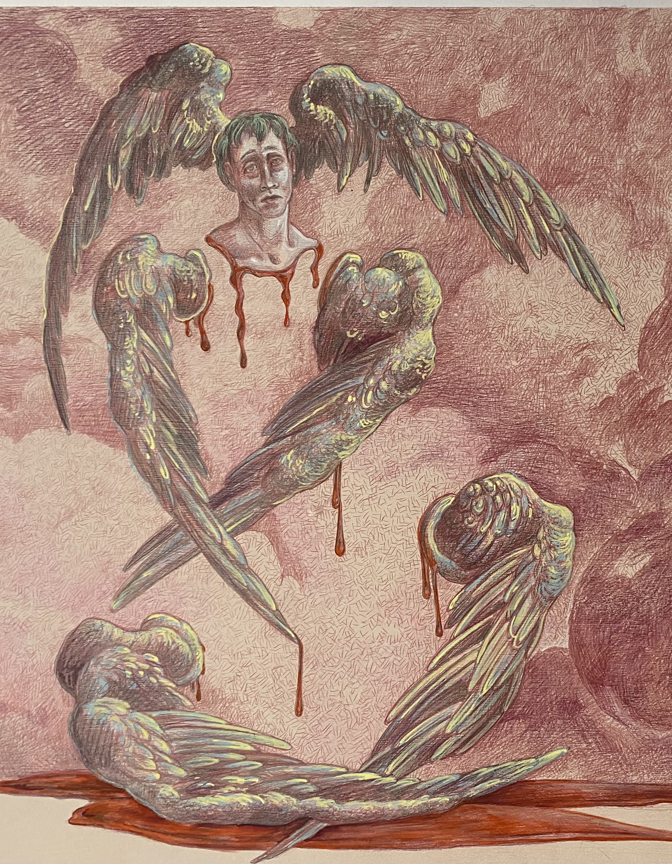 Speaking of the intangible , the conventional depiction of the Seraphim , here illustrated from the Petite Heures of Jean de France, Duc de Berry, conveys the fragility of their nature. I attempted to capture that shredded-butterfly-wing tragedy in my drawing.