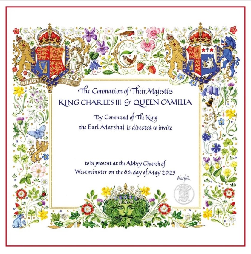 and I turn to them time and again (and they seem in to turn to me) . Just the other morning, from one of my numerous monarchial email updates, I received an “invitation” to Charles III upcoming coronation. Its design is charming, traditional yet bright and optimistic, a cheerful herald to this new Carolean Age ( may it be splendid and hopeful). The design not only delighted me but inspired with its Greenman theme.