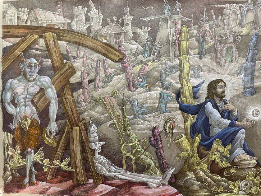Previous Image IMG_1630 The Temptation of Christ in the Desert of Lovelessness 2024 graphite and gouache on toned paper 18 by 24 inches