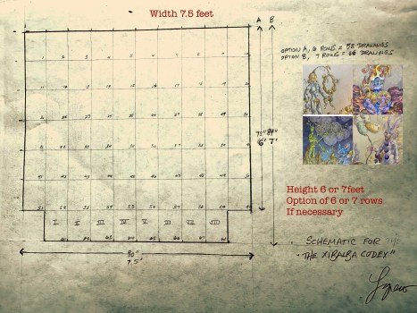 schematic for hanging the 68 drawings of The Xibalba Codex