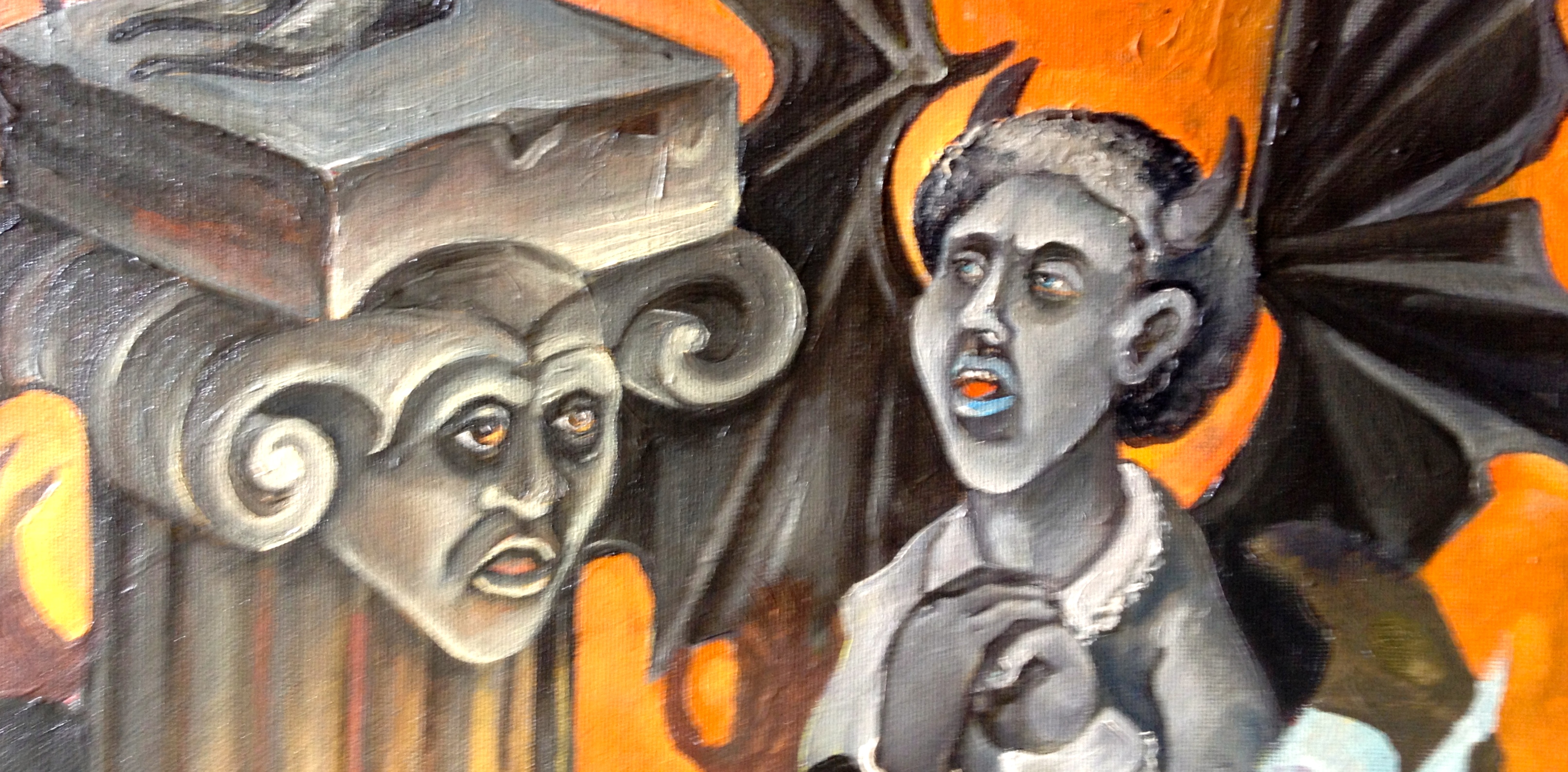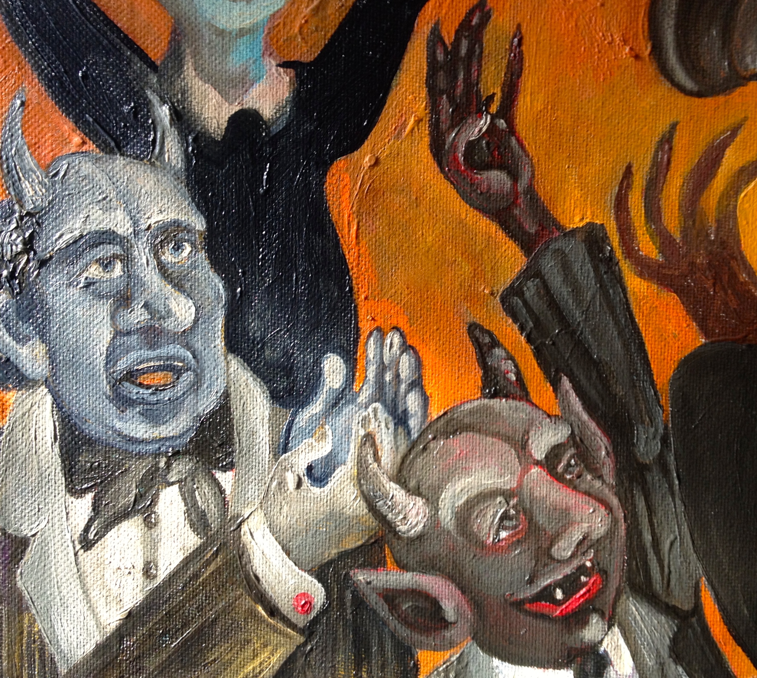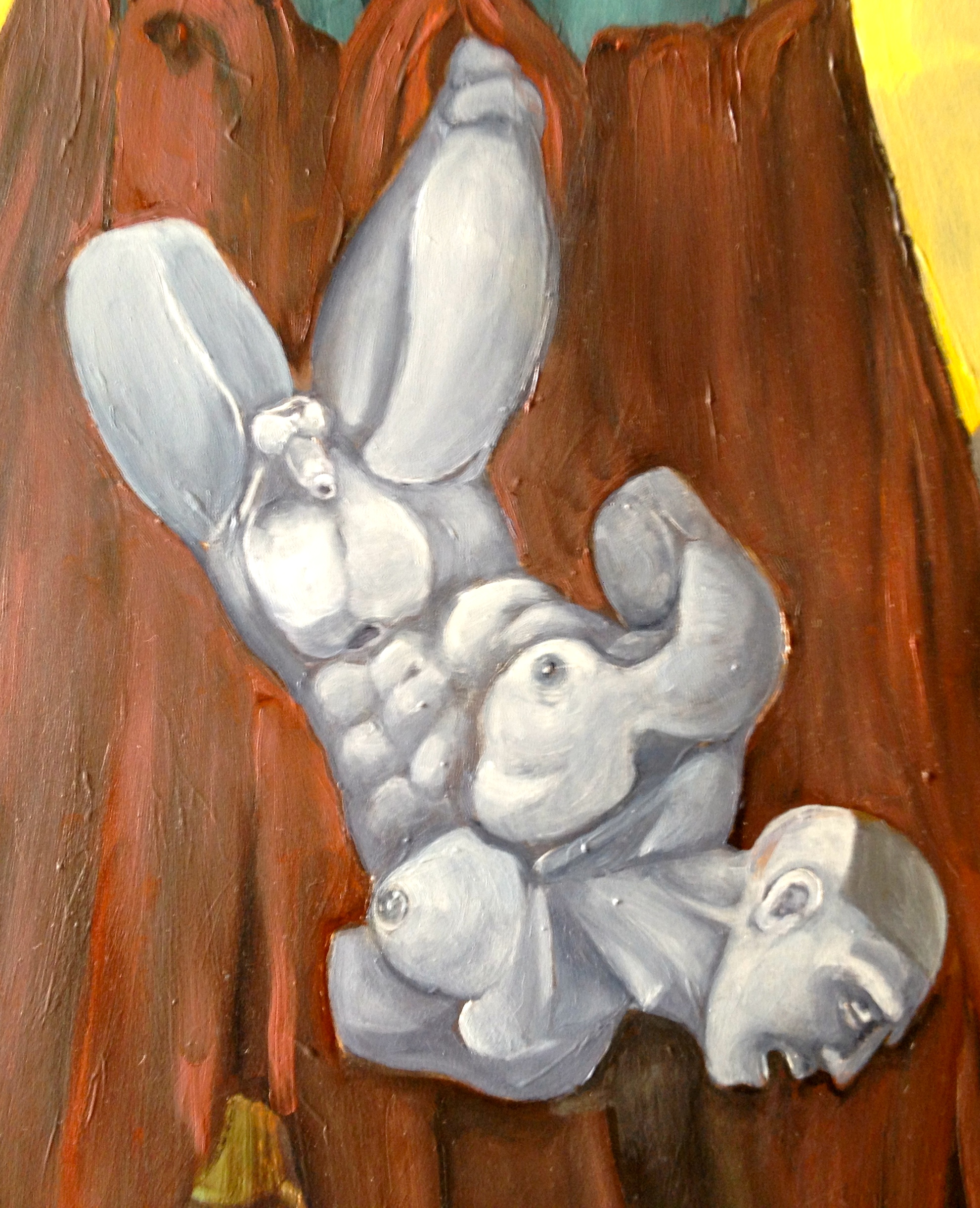According to the Miller/Traube Dictionary of the Gods and Symbols of Ancient Mexico, she is often depicted with a broom to represent her ability to cleanse; I thought a dainty dust rag more fitting for my goddess. I’m not going to psychoanalyze my own painting, why the amputated semi- aborted men? I do not know. I do know I chose butterflies, an almost universal symbol of the soul, some to be set free and to flourish and some to be crushed to their death, at her whim.
