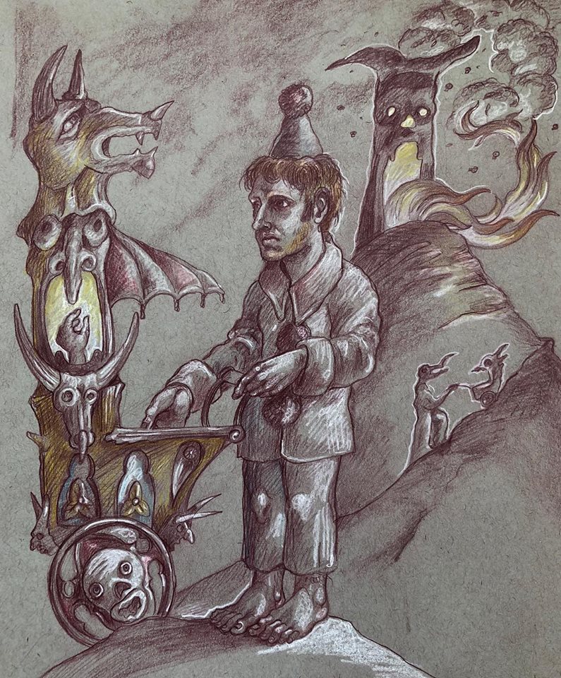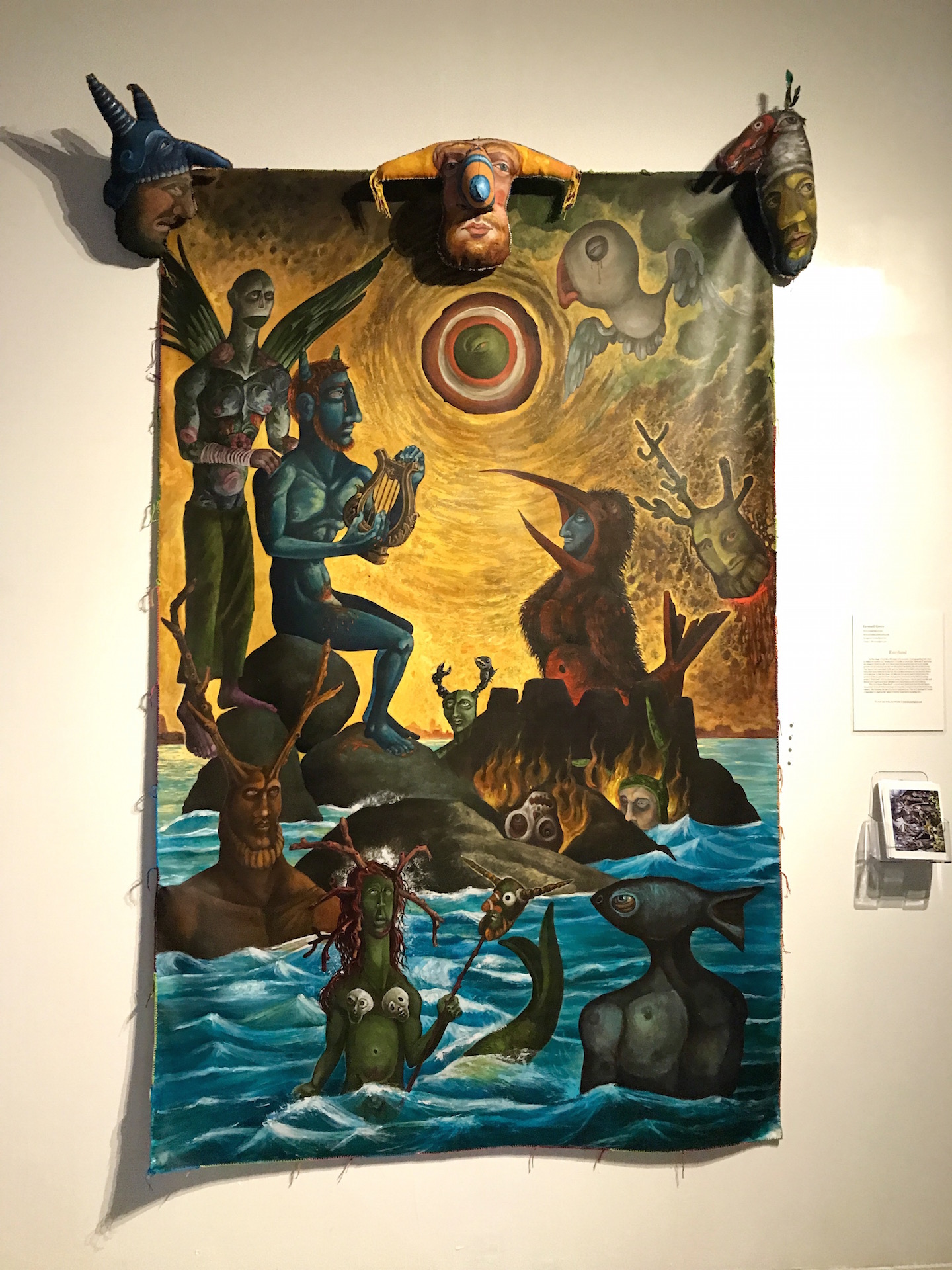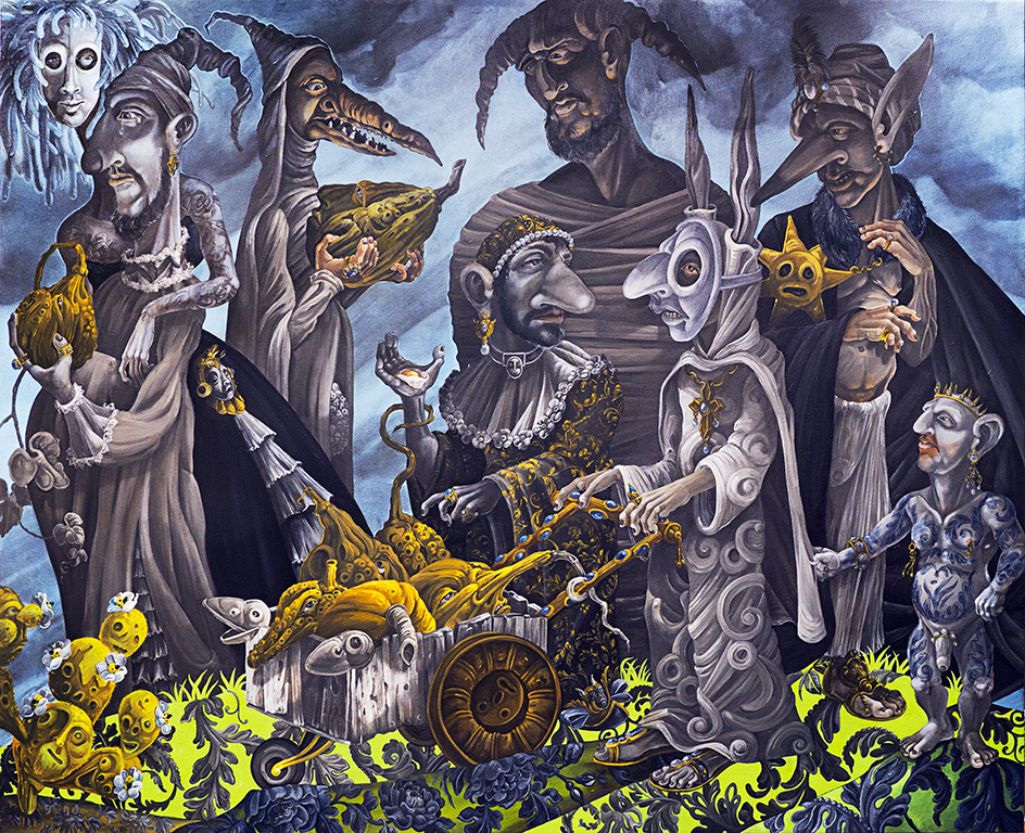 For this “painting” I have focused upon the memento mori theme, the endless cycle of life, death, and rebirth; hermits and Holy Fools and Death Angels populate this fertile sylvan scene.