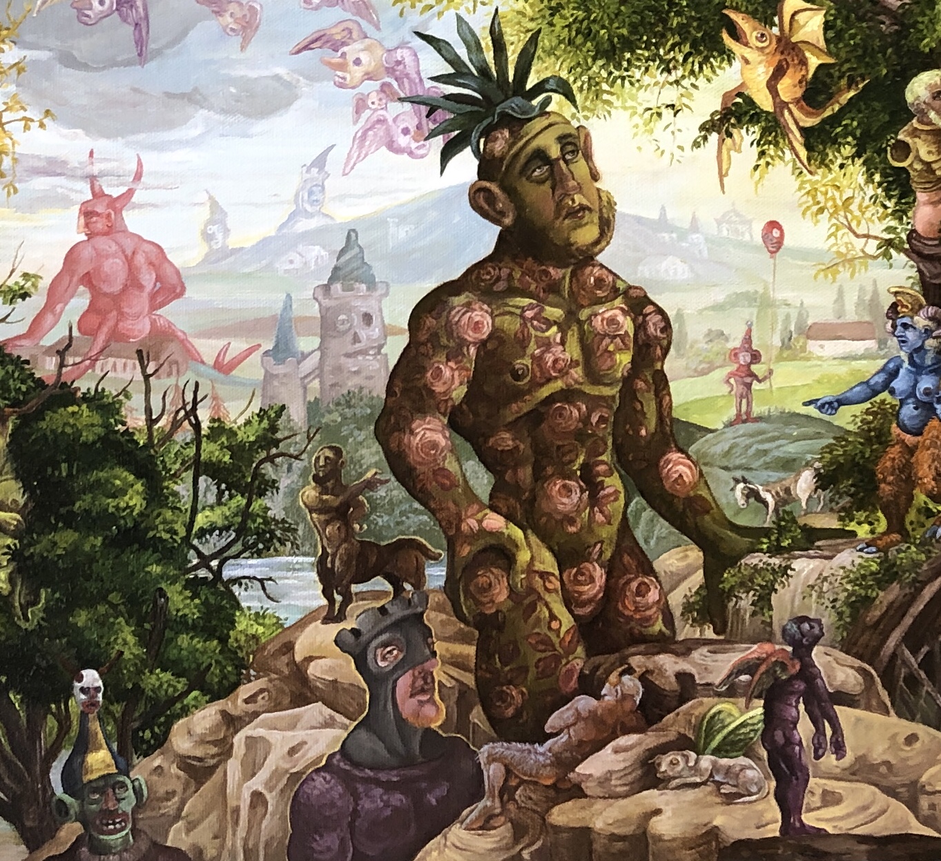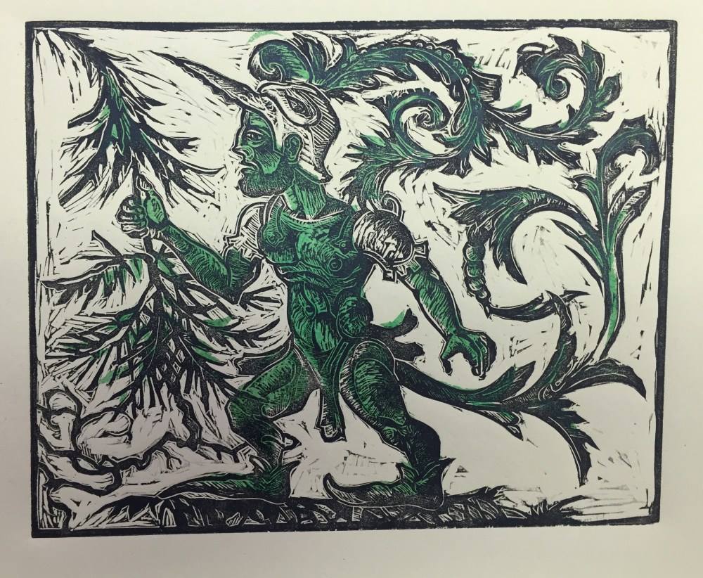The prancing faun, leading this merry display is an imagined reference to the greenery of the Knight’s nursery . In the painting , my interest was of the adolescence of the Green Knight, while still a youth, in the forest before his mysterious, frequently terrifying , oft told adventures began. Like Achilles I imagined the Green Knight having a sylvan tutor-akin to Achille’s watchful centaur guide Chiron – note, this is not at all part of the standard Arthurian narrative, simply a personal fancy. Who this fellow is (far right) I do not know, he went from a bald Druidic fellow in the initial working drawing to a blue bearded sage. Whoever he is he watches over the Green Knight and as parent would be, hesitant, concerned and yet encouraging of the nest leaving.