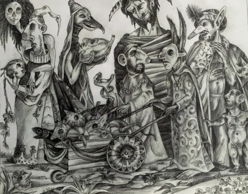 This painting unlike the last Temptation of St. Anthony of the Desert ( link: HERE) is a small little oil painting, only 16 by 20 inches. I painted smaller frankly because I am running out of studio space and I have two other large canvases that I am working on occupying two easels .