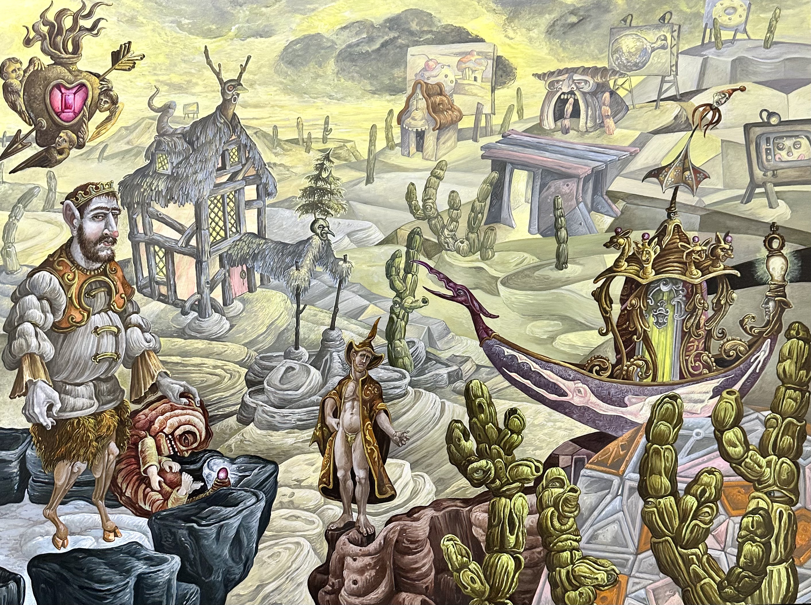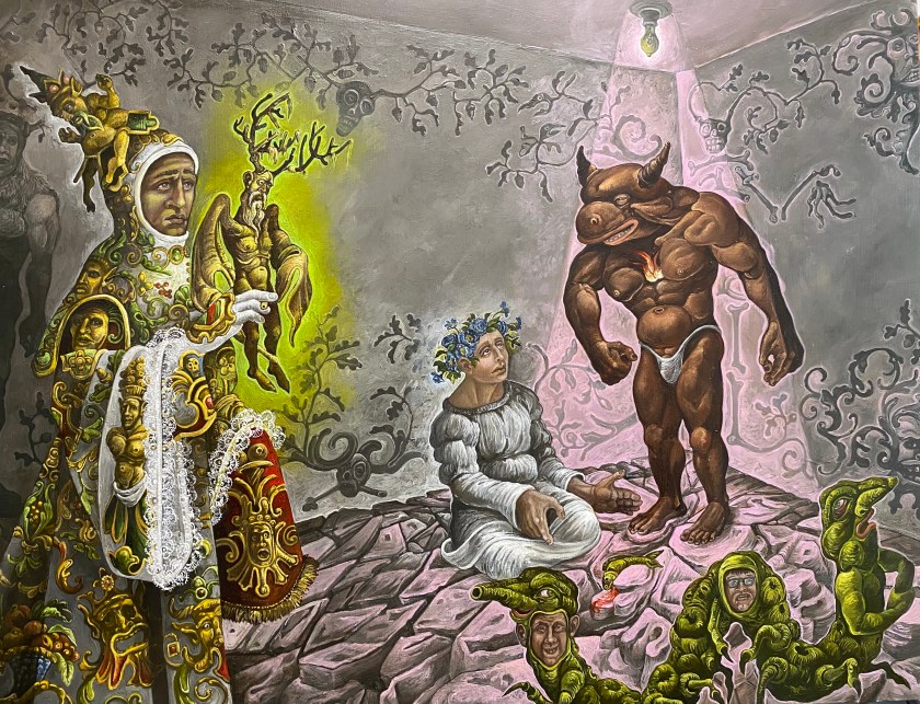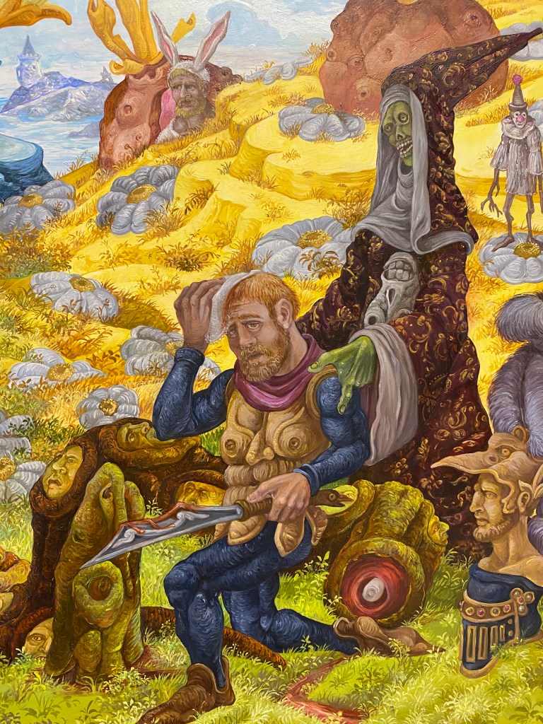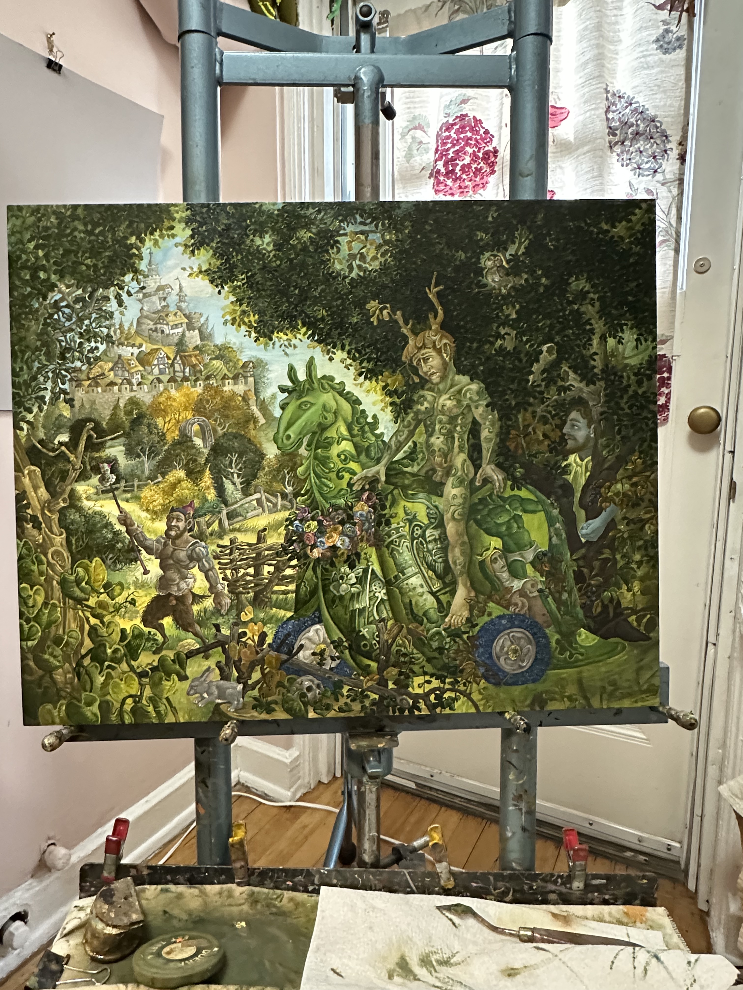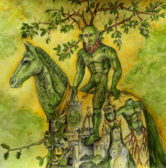 In this painting I have the greened Green Knight astride a nursery hobbyhorse , its wheels of forget-me-nots, noting a gentler fellow than the menacing wild man who bursts upon Arthur’s yuletide court. His hobbyhorse’s cape is ornamented with depictions of Bertilak’s castle, Bertilak’s comely and seductive bride, the Green Chapel , Death (looming throughout Gawain’s adventures) and the Green Knight himself , head in hand, menacingly empowered into full green manhood .