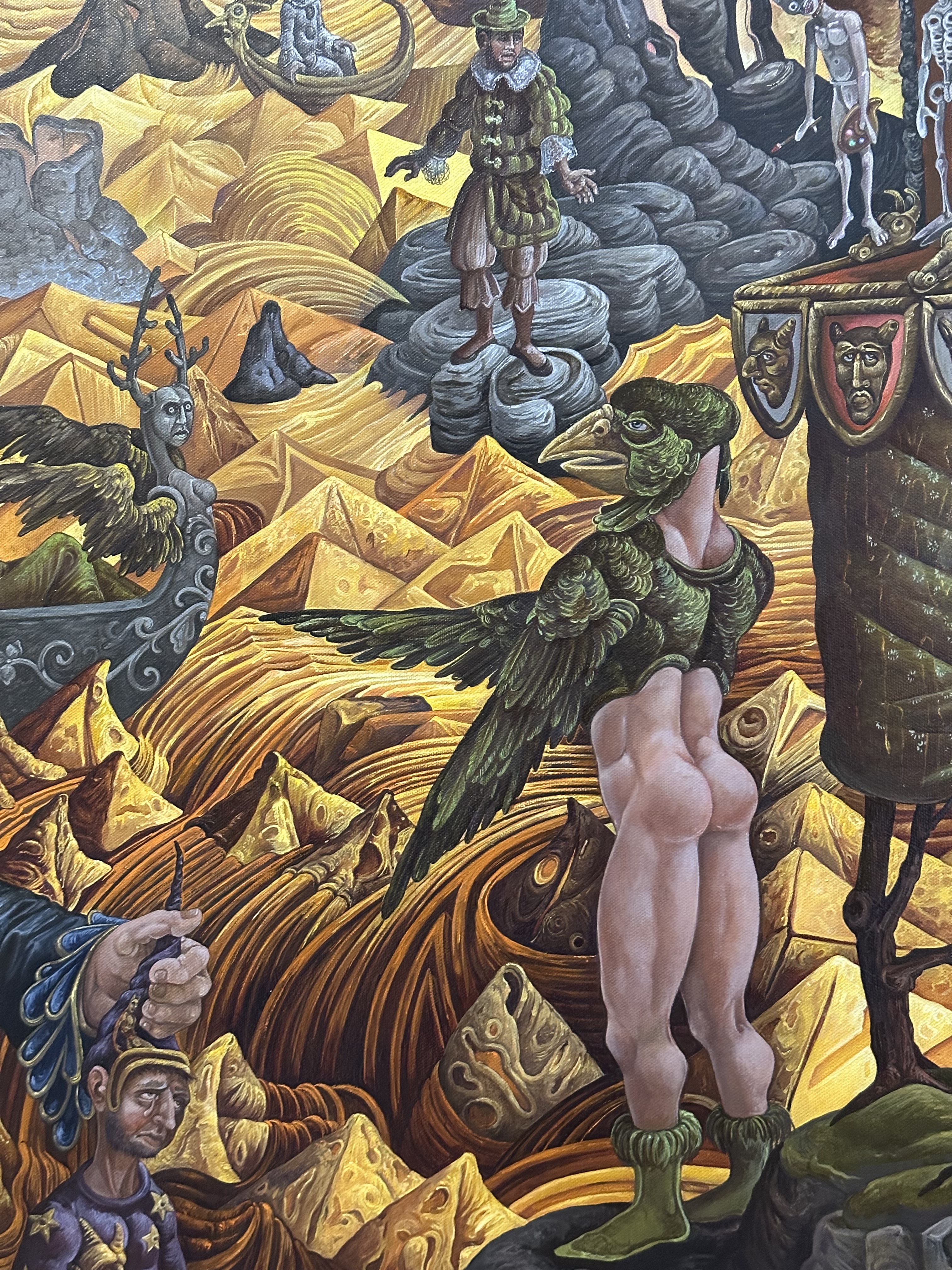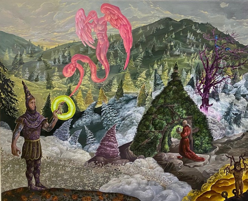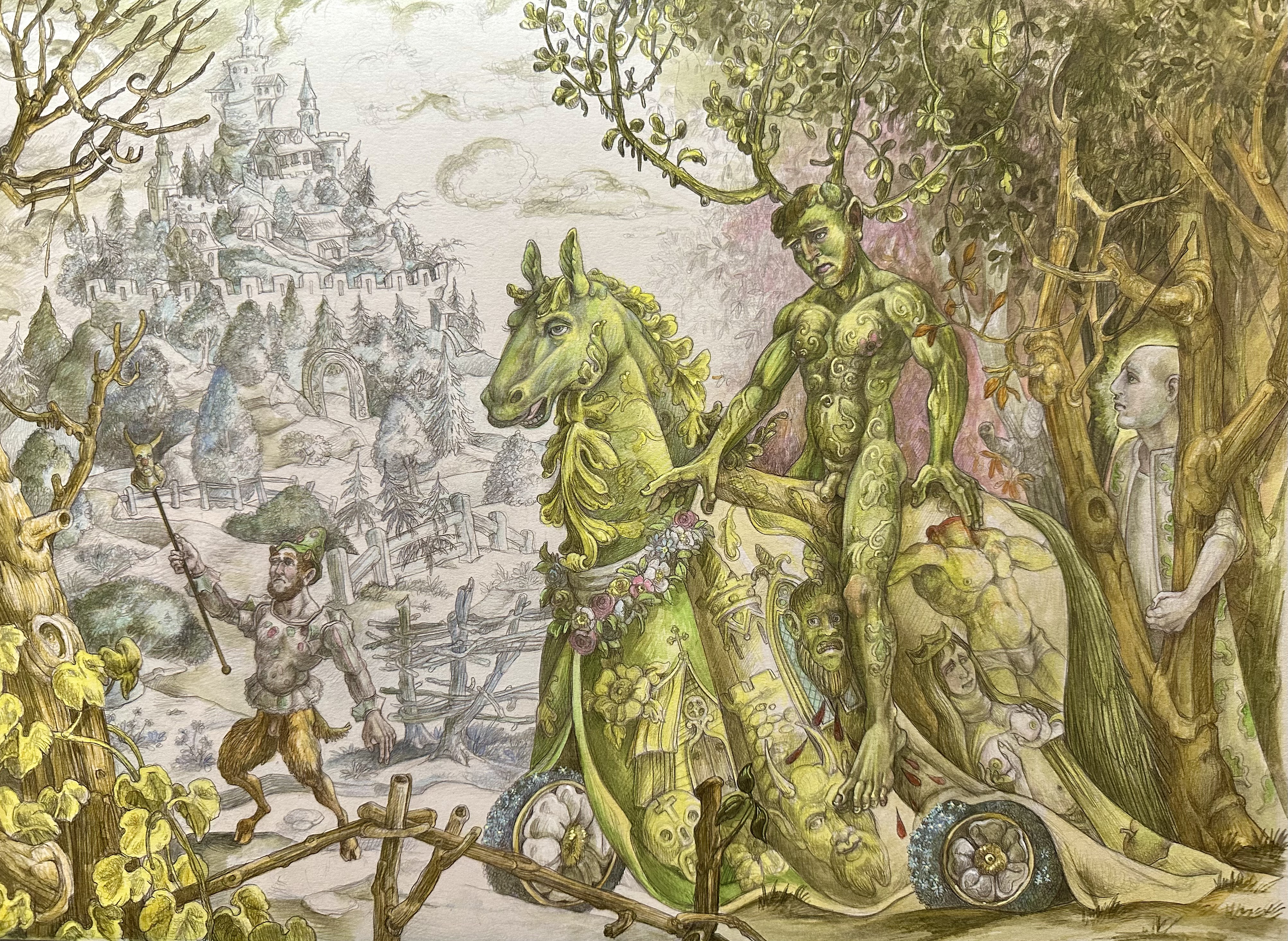 The prancing faun, leading this merry display is an imagined reference to the greenery of the Knight’s nursery . In the painting , my interest was of the adolescence of the Green Knight, while still a youth, in the forest before his mysterious, frequently terrifying , oft told adventures began. Like Achilles I imagined the Green Knight having a sylvan tutor-akin to Achille’s watchful centaur guide Chiron – note, this is not at all part of the standard Arthurian narrative, simply a personal fancy. Who this fellow is (far right) I do not know, he went from a bald Druidic fellow in the initial working drawing to a blue bearded sage. Whoever he is he watches over the Green Knight and as parent would be, hesitant, concerned and yet encouraging of the nest leaving.
