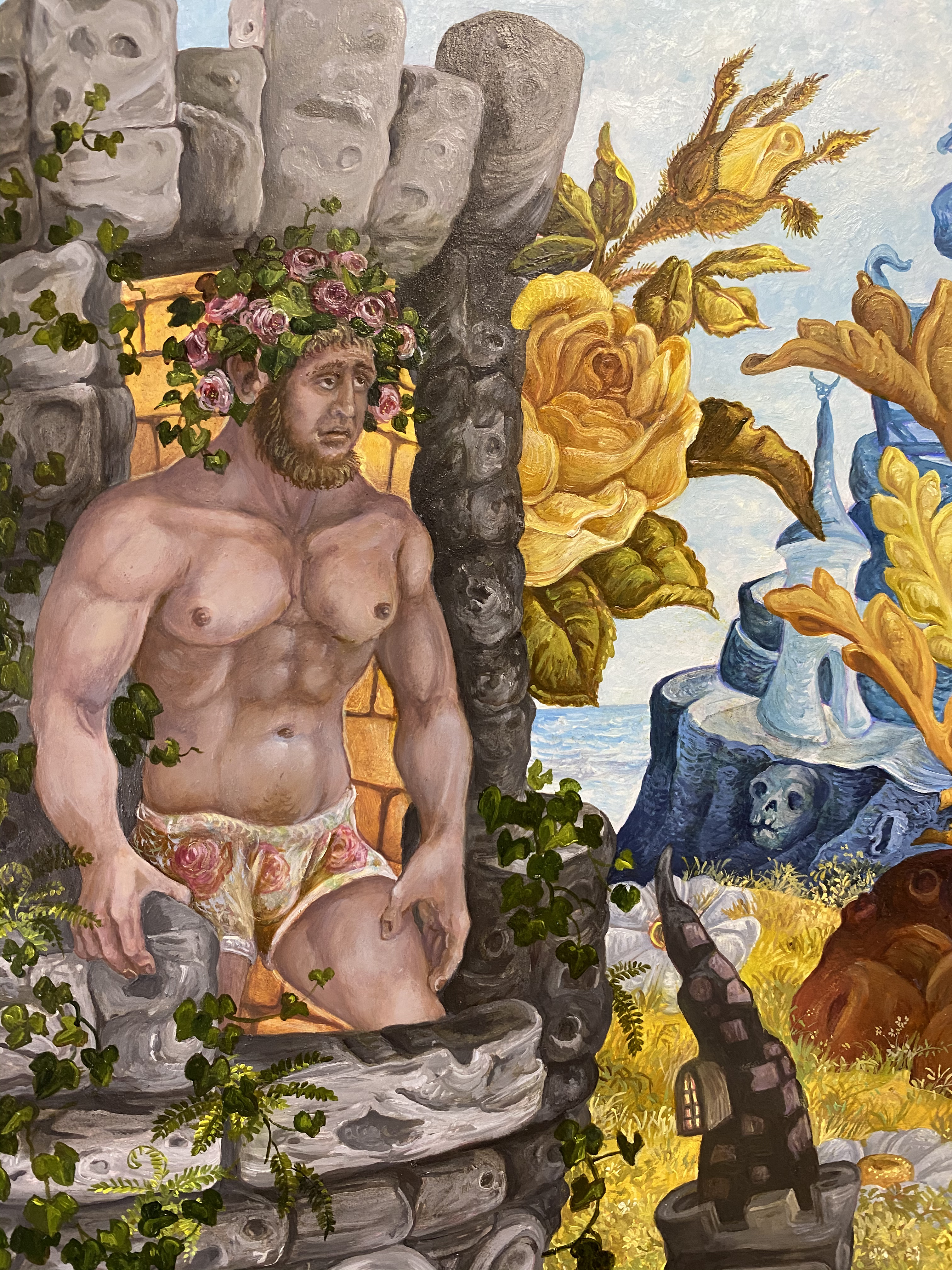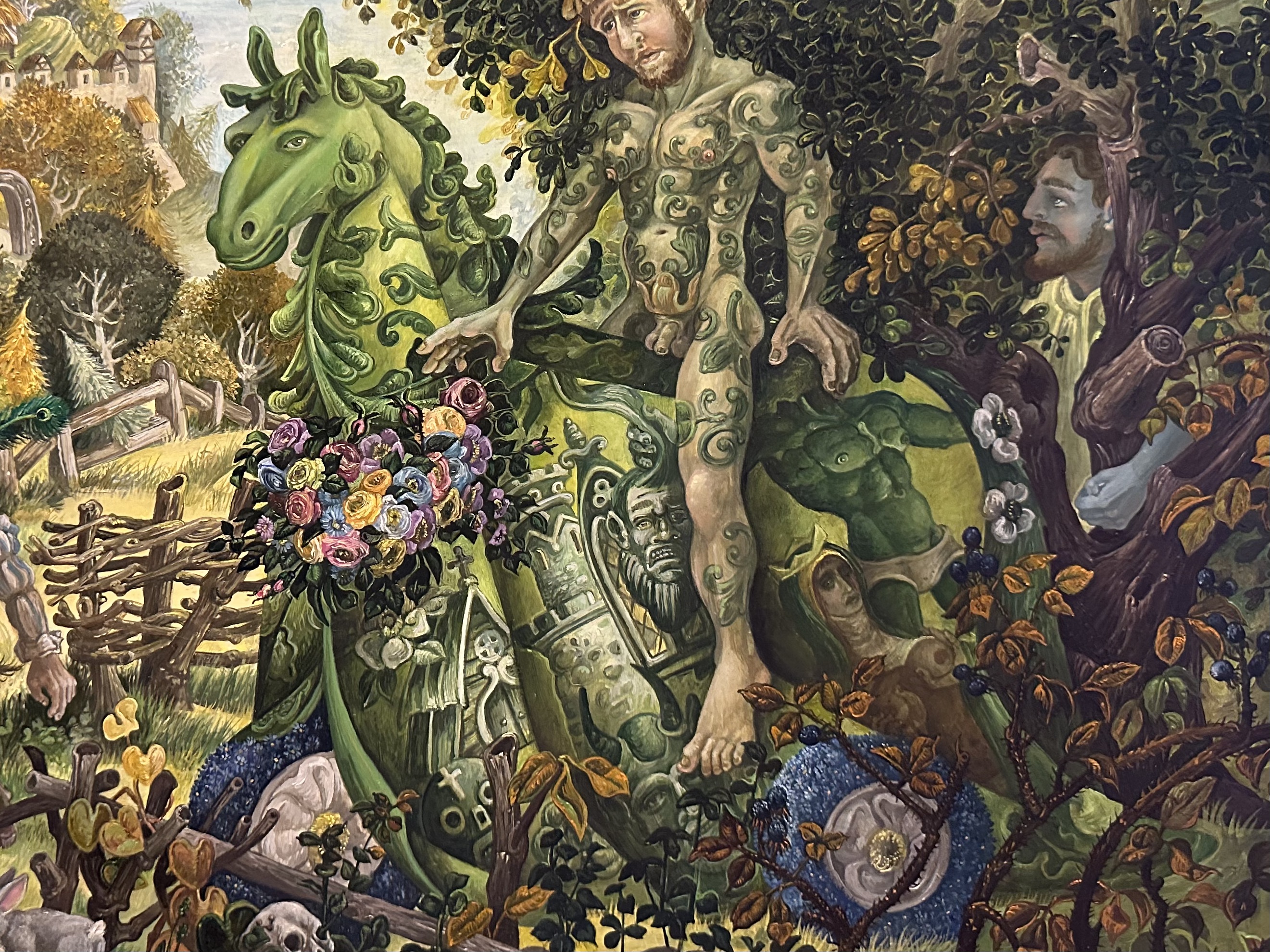 In this painting I have the greened Green Knight astride a nursery hobbyhorse , its wheels of forget-me-nots, noting a gentler fellow than the menacing wild man who bursts upon Arthur’s yuletide court. His hobbyhorse’s cape is ornamented with depictions of Bertilak’s castle, Bertilak’s comely and seductive bride, the Green Chapel , Death (looming throughout Gawain’s adventures) and the Green Knight himself , head in hand, menacingly empowered into full green manhood .