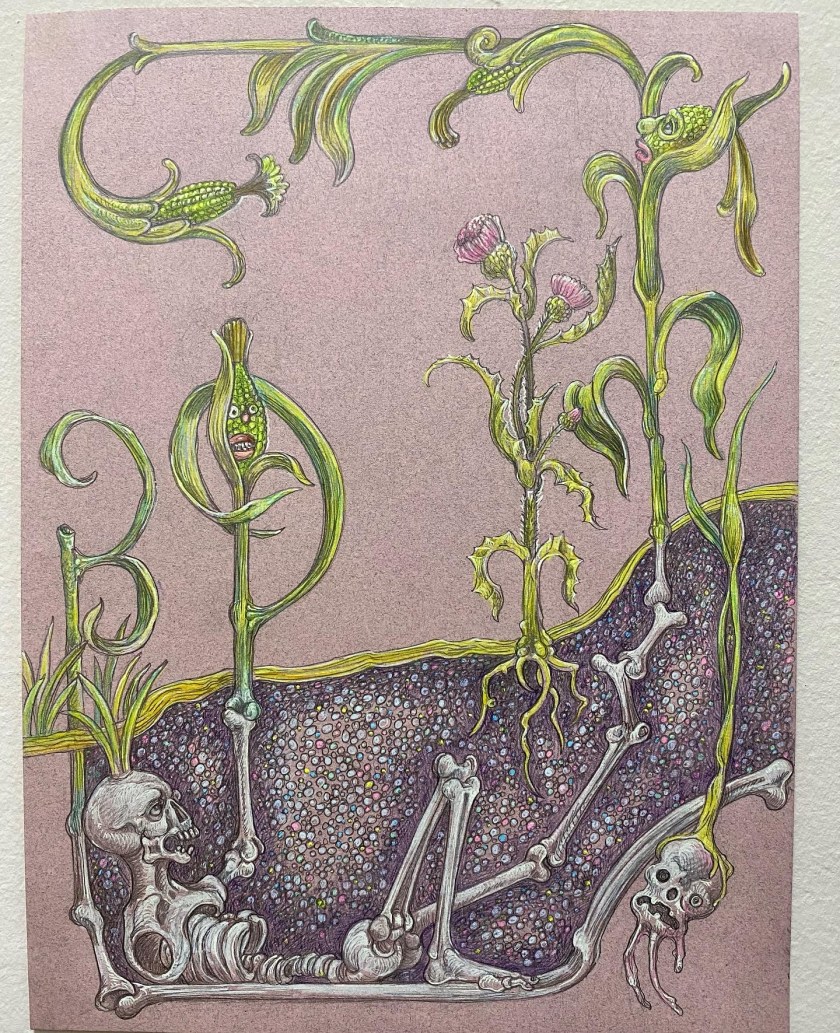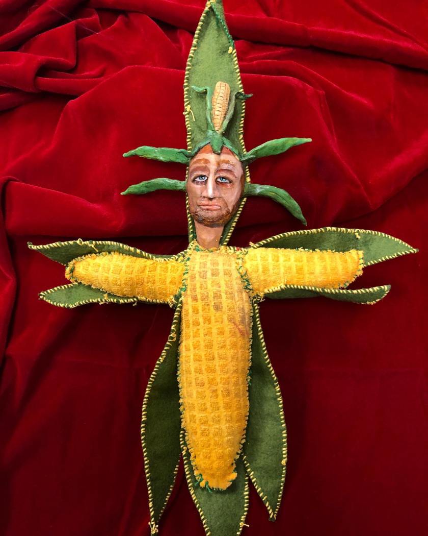 Rounding out the painting in the last quarter I have various moon gods, non specific, just pre Christian. Next to them stands an Earth Father figure. A softer kinder answer to the excesses of patriarchy. He is horned in his affiliation with old truths, old gods, old ways. He also reflects my evolving reintroduction to the Church, with the pope reminding me of Christ’s magnificent message. This figure is a tribute to that compassionate god. He may also be an incarnation of the great Maize-god, sacrificed father of the Hero Twins and of humankind , Hun-Hunahpu. It is through his death, we are born. Sound familiar ?