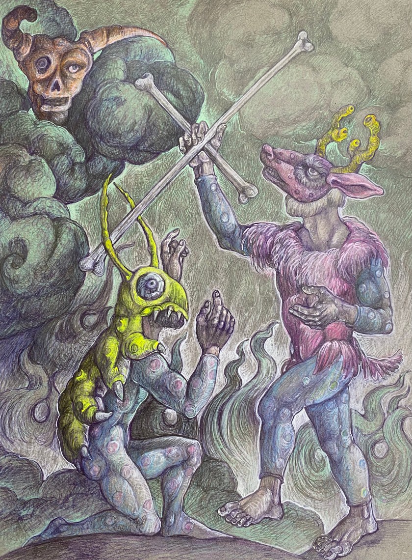 My initial conceit for this painting was to utilize “bad” gods, unfortunate figures, maligned archetypes, to do battle with the smug and sanctimonious , be it the Church herself, the pompous evangelist down the street, ISIS, or that homophobic second grade teacher who shamed you for playing with the girls. That said, the upper left figures are depiction of the denizens of Xiblaba, the underworld of the Popol vuh. Next, descending in a very theatrically baroque manner is the savior Quetzalcoatl . Below, stands the accursed Judas ( noose still dangling) and the blessed Magdalene, clad only in her long hair, as per the archetype. Next to her, stands the familiar companion of the Other, the Scapegoat.