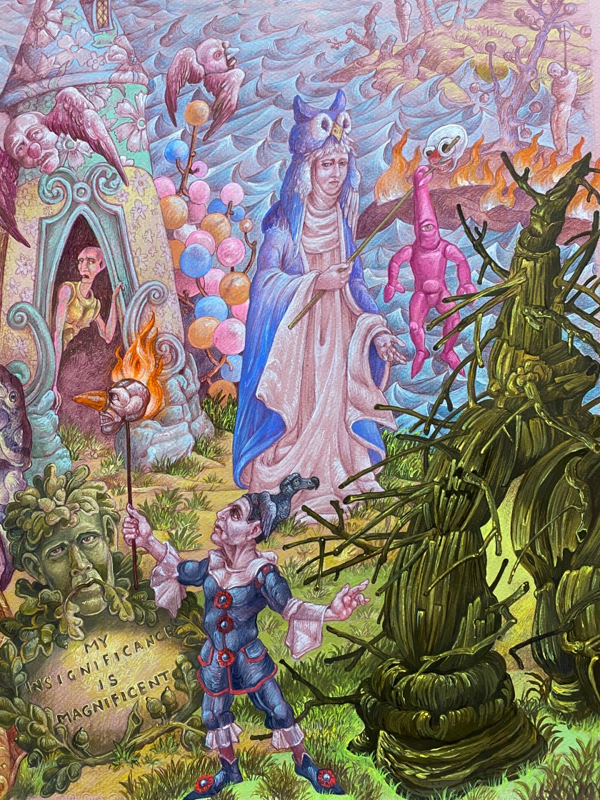The prancing faun, leading this merry display is an imagined reference to the greenery of the Knight’s nursery . In the painting , my interest was of the adolescence of the Green Knight, while still a youth, in the forest before his mysterious, frequently terrifying , oft told adventures began. Like Achilles I imagined the Green Knight having a sylvan tutor-akin to Achille’s watchful centaur guide Chiron – note, this is not at all part of the standard Arthurian narrative, simply a personal fancy. Who this fellow is (far right) I do not know, he went from a bald Druidic fellow in the initial working drawing to a blue bearded sage. Whoever he is he watches over the Green Knight and as parent would be, hesitant, concerned and yet encouraging of the nest leaving.