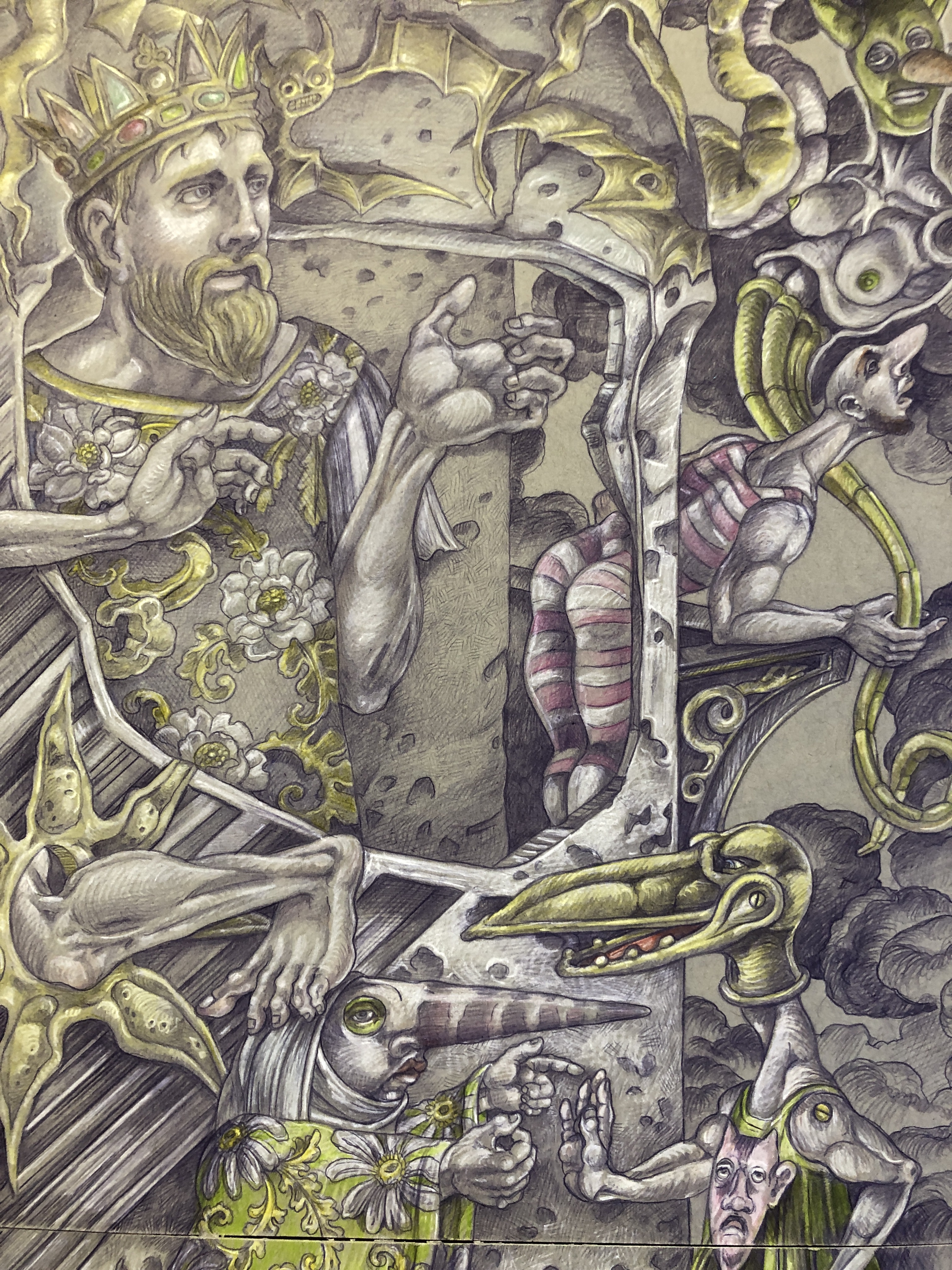He tossed aside his pretty things. His brocaded grass of green cope caterpillar velvet plush a cocoon of downy miniver; his linen smock that butterfluttered embroidery ever so clever with fleas centipedes and mites, his coif that glittered metallic verdure as pompously as the proud Junebug, these , his treasures, his jewels, his bedazzlements he tossed aside; hair pantaloons would have to do.